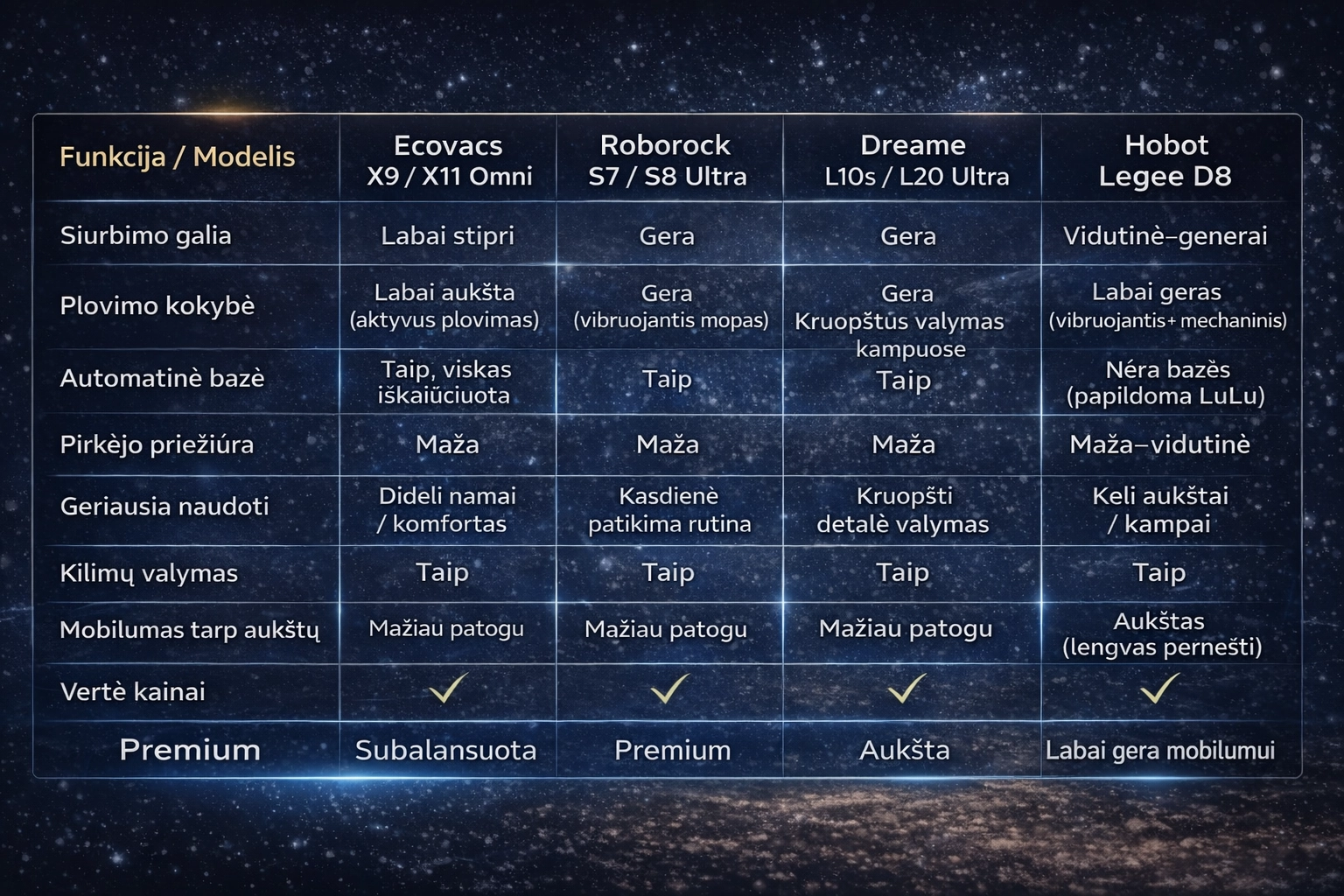 Renkantis plaunantį dulkių siurblį robotą, svarbiausia ne „kuris geriausias apskritai“, o kuris geriausiai tinka jūsų namams ir gyvenimo būdui. Visi šiame straipsnyje aptarti modeliai priklauso aukštesnei klasei ir leidžia palaikyti švarą su minimalia kasdiene priežiūra, tačiau jų stiprybės skiriasi.