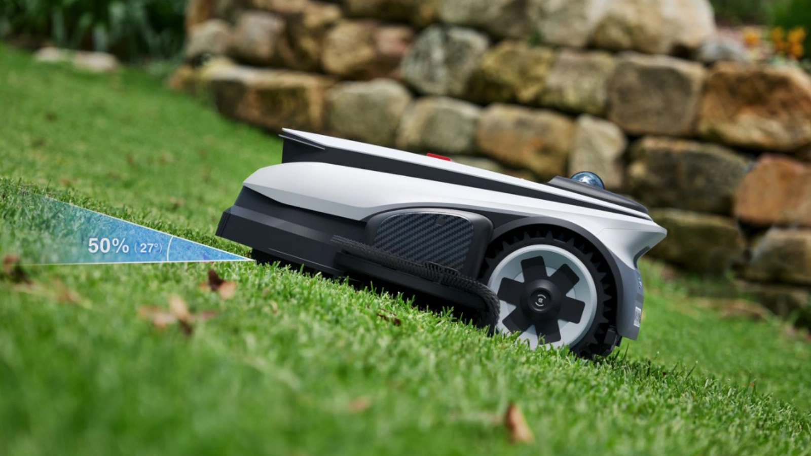 GOAT A1600 LiDAR PRO robotas puikiai įveikia iki ~50 % nuolydį (apie 27°), todėl jis tinkamas ne tik plokščiai vejai, bet ir šlaituotoms žolės dangoms, įkalnėms ar nuolydžiui sodo takams.
